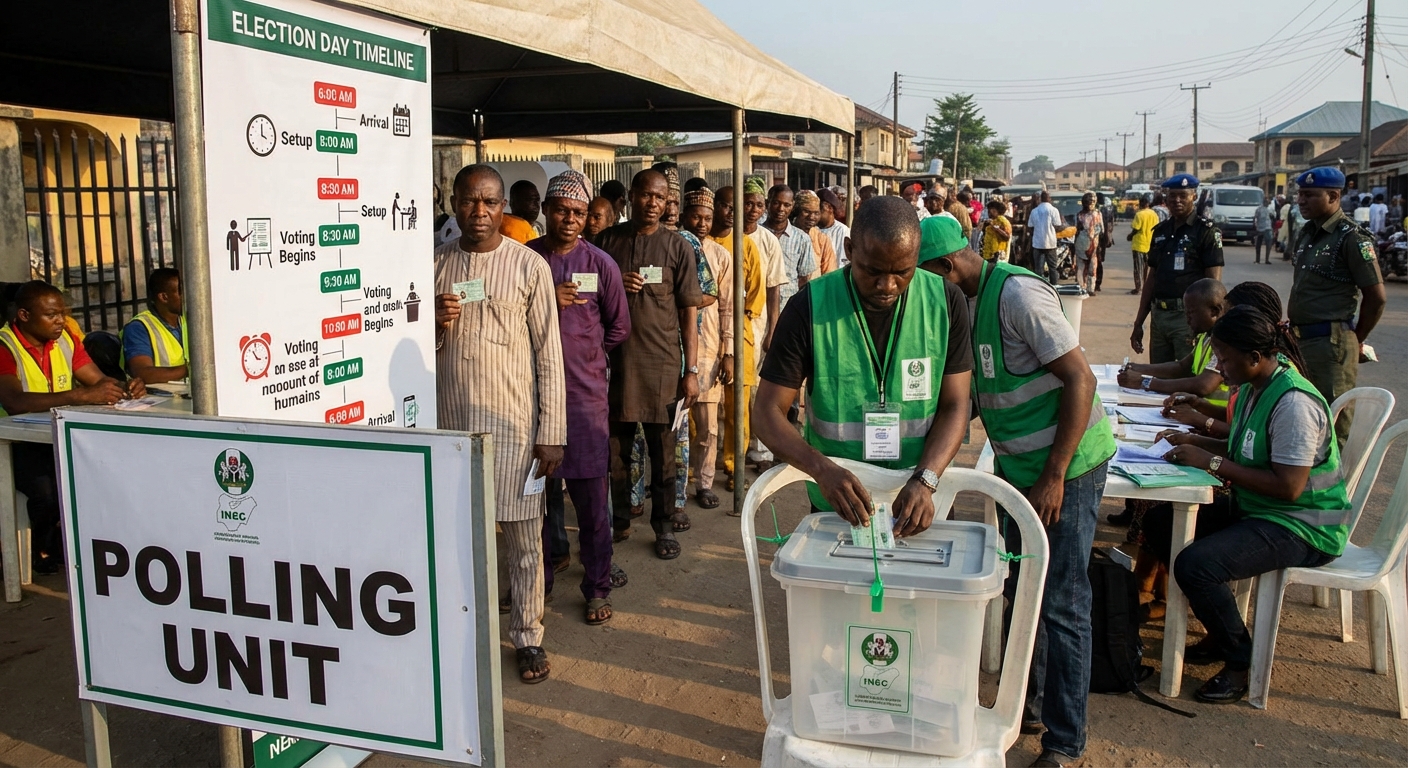 | Time | Activity | |------|----------| | 6:00 AM | INEC officials and materials arrive at polling units | | 8:00 AM | Setup begins — ballot boxes are displayed empty, materials are checked | | 8:30 AM | Voting officially begins — accreditation and voting happen simultaneously | | 8:30 AM – 2:30 PM | Voting period | | 2:30 PM | Voting ends — but anyone already in the queue can still vote | | After last vote | Counting begins immediately at the polling unit | | After counting | Results are announced, recorded, and uploaded |